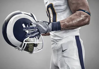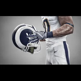 The Rams referred to this uniform update as an "evolving," in which the team removed the gold from their pants and brought back the blue and white helmets from the 1960s and '70s.
