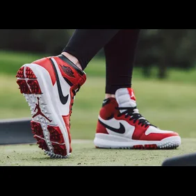 While the kicks feature a ton of similarities to the flat-bottomed Air Jordan 1s, you'll notice the chunkier midsole and the turf spikes popping out beneath the sole making these a functional shoe for a round of 18 at the country club.