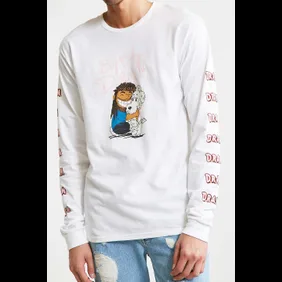 The Outkast tee is a pretty straightforward, black long sleeve T-shirt with the group’s signature logo across the front. The Mac Miller long sleeve tee is a bit more flashy, with a variety of illustrations from the artwork of “Dang!”, his popular single with Anderson .Paak, down each sleeve. The illustrated song title also appears on the front of the shirt. The Big Baby D.R.A.M. shirt is equally fun, with the rising rapper and singer’s name repeated down the sleeves and a Peanuts-style drawing of D.R.A.M. with his Labradoodle (the one from his album cover).