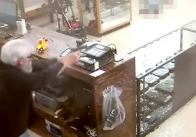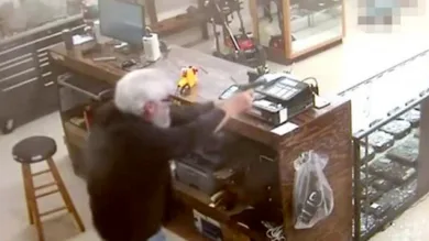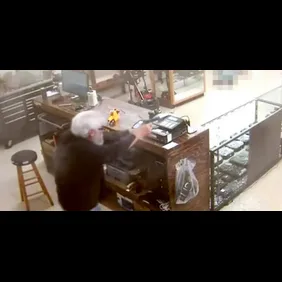 The whole scene was caught on camera. First one can see another employee enter the scene with his hands up, and then one can see the two armed robbers. Just as the would-be thieves were making their presence known -- telling the employees to get on the ground -- Groover whipped out his handgun, which was already on his person, and began firing off rounds. With his first shot, Groover hits and kills one of the robbers with a bullet that soared through the glass cabinet holding his store's guns.