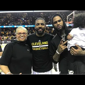 Following last night's Game 1 victory over the Toronto Raptors, Kyrie Irving popped off his special edition Nike Kyrie 3s and slid his way over to the court side seats to greet Dave East and his family.