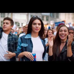In the failed commercial, Kendall leaves a photo shoot to join a festive social demonstration. The ad ends with her handing a Pepsi to an unsuspecting police officer, much to the delight of her fellow protestors. Though the scene seems to be set in the U.S., filming actually took place in Bangkok.