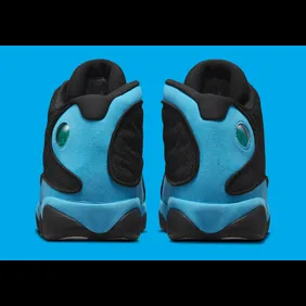 Firstly, the shoe begins with a mostly black upper. The all-over black look works well on this shoe, especially when paired with the university blue aesthetic. For instance, this popping shade of blue shows up on the mudguard, as well as the back heel. Lastly, the green "23" is found on the back heel, which was a huge staple of the Air Jordan 13.