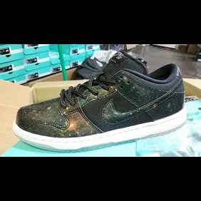 Images of the upcoming "420" Nike SB Dunk Low have surfaced online, showcasing a sticky green patent leather upper that features a galaxy-style print resembling weed crystals, accompanied by black mesh on the panels, tongue and ankle collar.