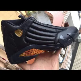 On the other hand, we have this blacked out Air Jordan XIV, also highlighted by hits of gold, and a "98" on the heel in place of the traditional 23.