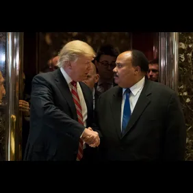 As Donald Trump's presidency has been mostly opposed by the black community, and as he has been accused of racial insensitivity throughout his road to the White House, there was much scrutiny on his actions and words today, it being Martin Luther King Jr. Day. Earlier today, Trump sent out a seemingly agreeable tweet, asking all Americans to honor the civil rights icon "for being the great man that he was," and it turns out that he also held a meeting with Dr. King's eldest son at Trump Tower.