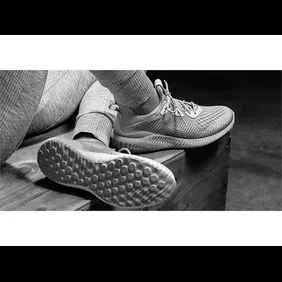 The upcoming collection includes new editions of the Adidas PureBoost and Alphabounce. The circular knit speckled gray PureBoost features a leather sockliner and heel inserts, while the light gray Alphabounce features a leather sockliner, eyestays, and space-dyed engineered mesh.
