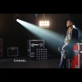 Skateboard P appears in the ads wearing a black Chanel jacket and the brand’s Gabrielle handbag in a music venue. He’s also wearing an impressive number of chains around his neck. Chanel’s head designer Karl Lagerfeld says the bag’s design was inspired by virtual reality goggles.
