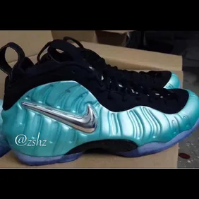The kicks feature a similar aqua colorway throughout the Foamposite upper, though the Nike swoosh is dressed in a shiny metallic silver, as opposed to the solid black that was used on the "Electric Blue" colorway.