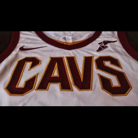 "The white Association edition uniform features CAVS across the chest in wine accented by a gold outline. The front and back player numbers are wine with a gold outline. The lettering (last name) on the back of the uniform is wine, as is the trim on the collar and shoulders of the jersey. The wine waistband on the shorts showcases the word “CLE” front and center."