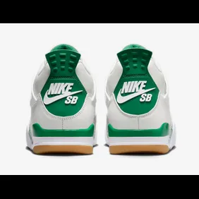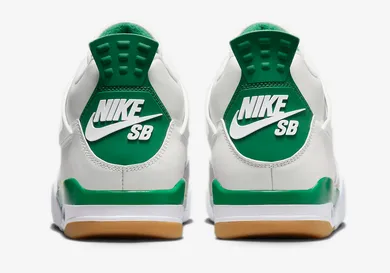 If you are a big Nike SB fan, then these kicks are certainly going to fill you with some joy. The SB look works very well with the Air Jordan 4 silhouette, and as you can see, there is a bit of a material shift here. Firstly, the upper is mostly covered in white leather. Secondly, at the toe box, extending to the sides, we have a strip of grey suede that helps add some contrast. Additionally, green is found all the way throughout the shoe, specifically on the back heel where we get Nike SB branding.
