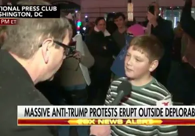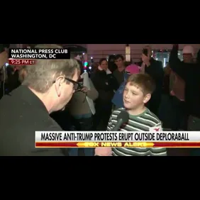 Protestors have flocked to D.C. to express their opposition to the presidency of Donald Trump, who's officially our man in charge as of early this afternoon. Last night, a young protestor by the name of Connor started a small fire outside of the National Press Club, where the pro-Trump "Deploraball" was being held. But the real flames didn't happen until long after the fire was extinguished, when he unloaded a refreshing burst of youthful honesty on an unsuspecting Fox News reporter.