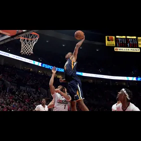 "The custom number font that was introduced in 2016 remains, as does the thick color blocking of navy, gold and green on the side panels. This color blocking—which is an homage to the coloring of the trim on classic Jazz uniforms and warmups—remains on the uniforms sliced at a 66-degree angle to match the angles of the Jazz logo."