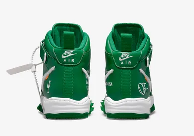 In the images above and below, you can find the "Pine Green" version of this Off-White x Nike Air Force 1 Mid. Immediately, you will come to realize that these are not for everyone. However, they are very cool, so there is that. Firstly, green adorns the upper and the spikes on the outsole. Secondly, the shoe gets an injection of white thanks to the Air logo on the tongue, the Nike swoosh, and of course, the infamous hang tag. Finally, we have an orange Air unit on the midsole. Seeing this unit is very unlike the Air Force 1, so it is cool to see here.