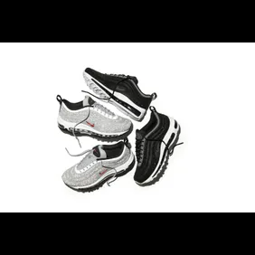 "The fabric was then applied through a heat fusing process, without any stitching, that uses precise pattern pieces — varying for each shoe size — to curve around the waves of the 97, including the expanse of the one-piece rand. As the shoe moves, the crystals refract light with a bright, shimmering effect. Released in black for Spring, and now in silver for Fall, the Air Max 97 LX with Swarovski crystals marks the first time NikeWomen has used Swarovski crystals on a shoe, as well as the first time Nike has fused precious material onto the Air Max 97."