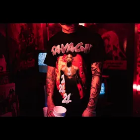 The collection includes long and short sleeve tees, hoodies and dad hats. The graphics on the tees are reminiscent of 90s photo collage hip hop gear, with large images of 21 Savage surrounded by large graphics of his name, flames and lightning. Another shirt plays off his Slaughter King mixtape cover. The whole lookbook takes inspiration from Drake's lo-fi, red-tinted "Sneakin'" video. There’s enough here to keep any Savage stan happy.