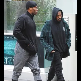 Kanye's been working out with celeb trainer Don Brooks, who's also worked with Kim, Kourtney and Khloe, and there workouts include resistance training with bands, jump rope, and some one-on-one bball (as seen in the pic above). Switching between 'Ye's home gym and local spots, each session can reportedly last up to two hours long too.