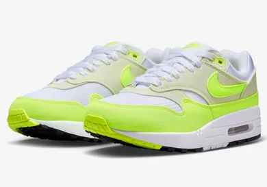 This sneaker is definitely a vibrant sneaker. The rubber sole features black, white, and the volt green. The midsole is a crisp white and includes a visible air bubble, as is customary for the Air Max 1. The upper is made up of volt green and grey suede and white mesh. Volt green details complete the sneaker on the tongue as the Nike logo, the lace locks, and on the sole as the stitched Nike Air logo. These sneakers will turn heads and bring maximum comfort.