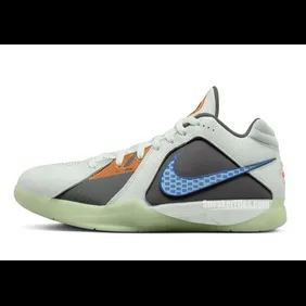 The sneakers feature a glow-in-the-dark rubber sole and a light blue midsole. The upper features a silver base with light blue overlays. Copper accents can be found by the laces, on the tongue, and on the heel. The Nike Swoosh is blue and features a "100" pattern, which is a nod to Kevin Durant's "Easy Money" nickname on the court. Overall, these sneakers are built for performance and allow Durant to play his best. The colorway is cohesive and will look fantastic on the basketball court.