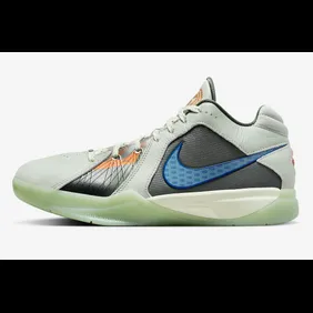 Firstly, this shoe has a grey base to it as seen by the overlays and even the toe box. Secondly, we get some black on the side panels and a blue Nike swoosh. Orange comes in on the tongue to bring it all together. Finally, the midsole has a glow-in-the-dark aesthetic to it that a lot of fans are going to adore.