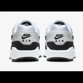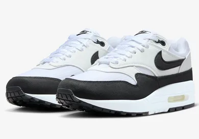 The sneakers feature a black and white rubber sole and a crisp white midsole that reveals the Nike air bubble, a staple of the Air Max 1. Nike constructs the upper with white mesh and leather, featuring black leather overlays. A black Nike swoosh and black Nike branding can be found on the sneakers. Also, black Nike Air branding can be found on a white leather patch on the heel. Other details include white laces and black lace eyelets.
