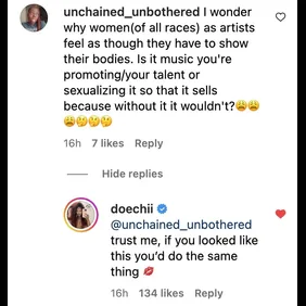 Unsurprisingly, not everyone was a fan of the lack of clothing in the stylish singer's upload. "Trust me, if you looked like this you'd do the same thing 💋," the "Persuasive" artist confidently wrote back. What are your thoughts on Doechii's response to the criticism surrounding her latest scantily clad photo shoot? Let us know in the comments, and check back later for more hip-hop/pop culture news updates.