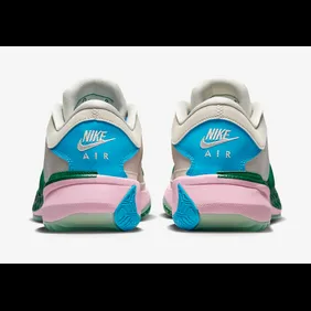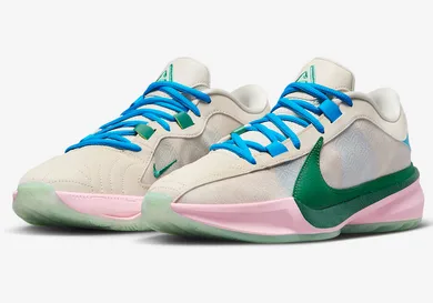 The sneakers feature a semi-translucent green rubber sole with a light pink midsole. The midsole features Nike Zoom technology which allows any basketball player to stay comfortable during gameplay. The uppers feature a sail knitted material and a large dark green Nike Swoosh stands out. The laces are a vibrant blue color and the heel features the same blue. White Nike branding can be found on the heel and the Giannis logo can be found on the tongue, in green. Overall, these sneakers are clean and represent the Antetokounmpo basketball legacy.