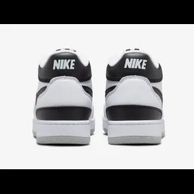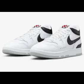 The sneakers feature a light grey rubber sole with a clean white midsole. White leather and mesh dominates the uppers, with more white overlays. The theme continues with white laces and an all-white sock liner. A black Swoosh, and black leather overlays near the heel and sock liner, add a new dimension to the sneakers. Red Nike branding sits on the tongue, atop checkered branding. White Nike branding is found on the heels, on the black leather heel tab.