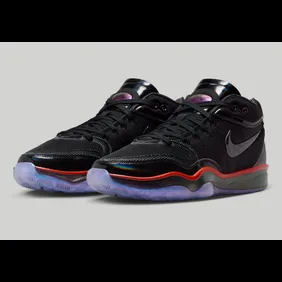 The sneakers feature a metallic purple rubber sole and a black midsole that features a red strip across the sneakers. A black mesh material constructs the uppers, with metallic accents on the toebox, Swoosh, and tongue branding. These sneakers feature a cohesive color scheme, with black as the dominating color. Also, they will certainly hold up on the basketball court.