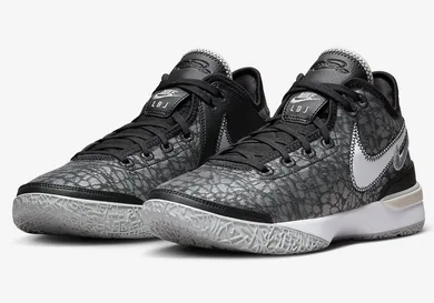 The sneakers feature a grey rubber sole with a geometric pattern and a white midsole. A grey mesh constructs the uppers, with a black lining found throughout. A white Nike Swoosh features black stitching and a smaller, silver Swoosh below it. "Nike LBJ" is located on the tongue, and King James' logo is located on the black tongue. Finally, the sneakers feature a silver "XX" detail on the heels of the sneakers.