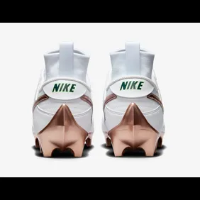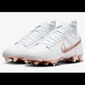 The cleats feature metallic rose gold spikes that feature a Nike Swoosh on the sides. White leather constructs the uppers, with more white leather overlays. The sides feature a metallic rose gold Nike Swoosh that matches the spikes, while the tongue and heels showcase green and black Nike branding. The insoles also feature Kyler Murray's logo. Overall, this pair channels Kyler's spirit in a performance cleat.