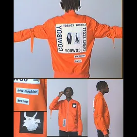 The text and imagery makes reference to Travis’s Cowboy aesthetic and a few reference his most recent album Birds In The Trap Sing McKnight. The additional “Prototype” text may or may not be taken from his upcoming Astroworld album.