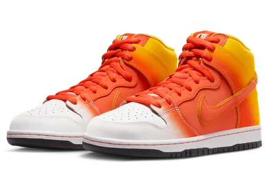 The Nike SB Dunk High is causing a buzz with its upcoming "Sweet Tooth" colorway, reminiscent of candy corn. This eye-catching design is set to satisfy sneaker enthusiasts and sweet tooths alike. With a vibrant mix of orange, yellow, and white, these kicks mirror the iconic candy's colors. The playful detailing doesn't stop there; the shoe's texture mimics the sugary treat's stripes, adding a delightful twist to your sneaker game.