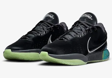 The sneakers feature a semi-translucent green rubber sole and a dark grey midsole. A black suede constructs the uppers, with white accents on the Nike Swoosh and near the laces. LeBron's signature logo is found on both tongues, and a wavy, roped design is featured on the heels. Overall, this pair is engineered for performance on the basketball court and is released in a clean colorway. A black base with vibrant accents near the heel is the perfect look for LeBron's newest Nike basketball silhouette.