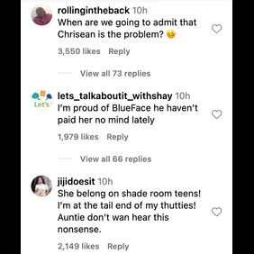 "When are we going to admit that Chrisean is the problem? 🥴," one user asked after catching up on the tea. "I'm proud of Blueface, he haven't paid her no mind lately," another chimed in. "Anything to get her [baby daddy's] attention," someone else suggested.
