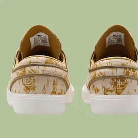 The sneakers feature a gum rubber sole with a clean white midsole that features a black strip around. A cream leather constructs the base of the sneakers, and the shoes feature a black Nike Swoosh on the sides. Cream laces complete the design, and Stefan Janoski's branding is located on the tongue. Overall, these sneakers are engineered for skateboarding. They feature a clean colorway that incorporates light tones throughout.