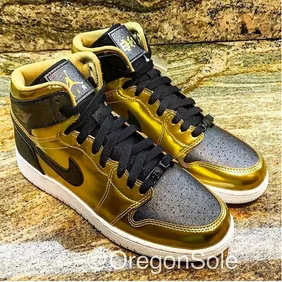 Today, we have our first look at the grade school "BHM" Air Jordan 1 which sticks to the black and gold color scheme although it goes much heavier on the glitzy gold and ditches the patches altogether.