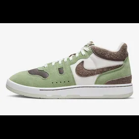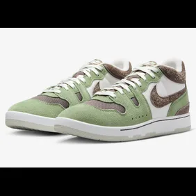 The sneakers feature a light green rubber sole with a white midsole. A white material makes the base of the uppers, with oil green and brown hairy suede overlays. The brown Nike Swoosh adorns the sides, and white laces complete the design. The shoes feature checkered tongues with Nike branding. Also, the heels feature white Nike branding. Overall, these sneakers feature a clean combination of oil green and brown and even feature a nice texture with the suede.