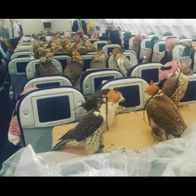 Being a Saudi prince has its perks. Rolling in the oil money allows one to fill a plane with his own entourage. One Saudi prince recently booked 80 seats for his friends ... his fine-feathered friends, that is. That's right, a new viral picture, taken onboard a Middle Eastern airplane, shows the full middle section of the economy class being occupied by beautiful birds of prey. Passengers seated on the sides of the plane don't seem to be mind being in the air with 80 falcons.