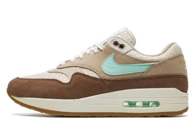The Nike Air Max 1 Crepe is a subtle and stylish choice, featuring a cream-colored hemp upper, brown suede mudguard, and tan nubuck overlays. In Medium Brown, Mint Foam, Mushroom, and Muslin hues, it sports a mint green Swoosh that complements the embroidered Nike Air logo on the heel. With a crepe outsole and off-white polyurethane midsole, it offers comfort and understated elegance—a perfect holiday gift.