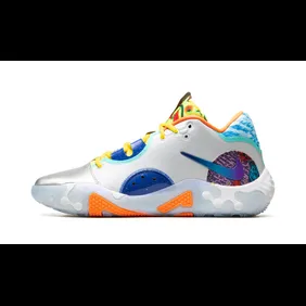 The Nike PG 6 "What The?" mixes lots of different colors on a mostly white base. These sneakers are special and part of Paul George's collection. They're comfy and good for playing basketball. The mix of colors makes them stand out and look unique. Overall, these sneakers are colorful, feel nice on your feet during a game, and are a great choice for style and comfort.