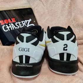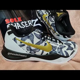 The sneakers feature a black rubber sole and a clean white midsole. A white material constructs the uppers, with a butterfly pattern throughout. A gold-stitched Nike Swoosh adorns the sides, as well as the Kobe Bryant logo on the tongue. Also, the left heel features "GIGI" while the right features the number 2, both a tribute to Gigi Bryant. Overall, these sneakers have significant meaning outside of basketball. That being said, the performance of the Kobe 8 is incredible, and these will hold up on the court.