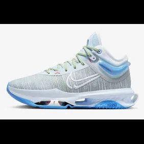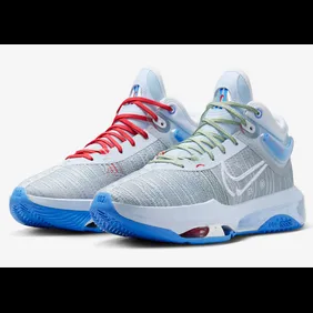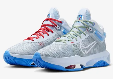 The sneakers feature a blue rubber sole and a white midsole that features a full-length Air Zoom Strobel unit and two round Air Zoom bags. Grey mesh constructs the uppers, with white snowflake details and a stitched Nike Swoosh. Also, the sneakers feature red and white laces and Nike branding on the tongue and the heels. Overall, theses sneakers take on a cohesive, Christmas-themed colorway. Style on the court in festive themes, and feel confident that this pair is going to hold up.