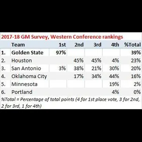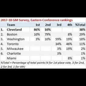 In the Eastern Conference, a majority of GMs believe the top-four teams will be the Cleveland Cavaliers, Boston Celtics, Washington Wizards and Toronto Raptors. Similarly, out West there appears to be a clear cut top-four as well, consisting of the Golden State Warriors, Houston Rockets, San Antonio Spurs and Oklahoma City Thunder.