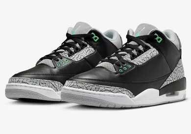 The Air Jordan 3 is a famous sneaker with a legendary status in the sneaker world. People are excited about its upcoming "Green Glow" colorway. This new version adds a bright green color to the classic design, making it modern and eye-catching. The shoe keeps its special elephant print on the heel and toe, giving it a nostalgic touch. The mix of green with the usual black-and-white colors makes it really stand out.