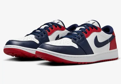 The Air Jordan 1 Low Golf is a popular choice for golfers, known for its stylish design and performance on the course. Sneaker enthusiasts are eagerly awaiting the release of its upcoming "USA" colorway. Further, this new edition features a patriotic color scheme, with a combination of red, white, and blue accents. The iconic Air Jordan silhouette is transformed into a golf-ready shoe, perfect for hitting the links in style. Overall, with its durable construction and comfortable fit, the Air Jordan 1 Low Golf is sure to be a hit among golfers of all skill levels.