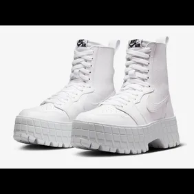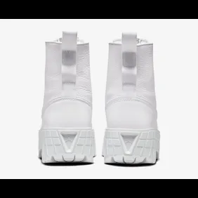 These shoes boast a substantial white sole and midsole, adding noticeable height to your stride. The uppers are crafted from a white leather base, complemented by matching leather overlays throughout. The iconic Nike Swoosh, laces, tongue, and heel tab all sport the same shade of white. Nike branding is prominently featured on the tongue and heels. As a WMNS exclusive release, these sneakers will only be available in women's sizes, ensuring a tailored fit for female sneaker enthusiasts.