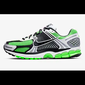 The Nike Zoom Vomero 5 is set to make a statement with its upcoming "Electric Green" colorway. This vibrant release features a striking green color scheme that is sure to turn heads. The upper is predominantly electric green, creating a bold and energetic look. Black accents add depth and contrast, highlighting the shoe's design elements. Metallic silver details further enhance the aesthetic, giving the sneaker a modern and sleek finish. The Zoom Vomero 5 is known for its comfort and performance, making it a favorite among runners and casual wearers alike.