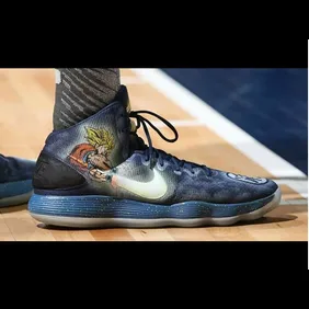 So far this season he has laced up custom "Stranger Things" Hyperdunks as well as a Grinch-themed pair for Christmas and a Halloween edition that featured Jason Voorhees. Last night in Minnesota, KAT was at it again, this time rocking Kickstradomis' Dragon Ball Z-inspired "Super Saiyan" Nike HyperDunk 2017.
