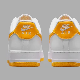 The sneakers feature a grooved white sole with a white midsole that features a yellow streak. The uppers are constructed completely of white leather and the Nike Swoosh is featured in purple leather. The laces and the sock liner are both white, adding to the minimalism of the sneakers. The heel tab is also purple and features white Nike branding. Finally, yellow Nike branding can be found on the tongue.
